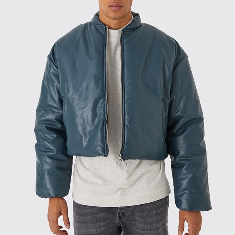 Custom Warmer Winddicht Winter Donsjack Glanzend Outdoor Gewatteerde Puffer Bomber Boxy Cropped Pu Lederen Rits Puffer Jack Heren